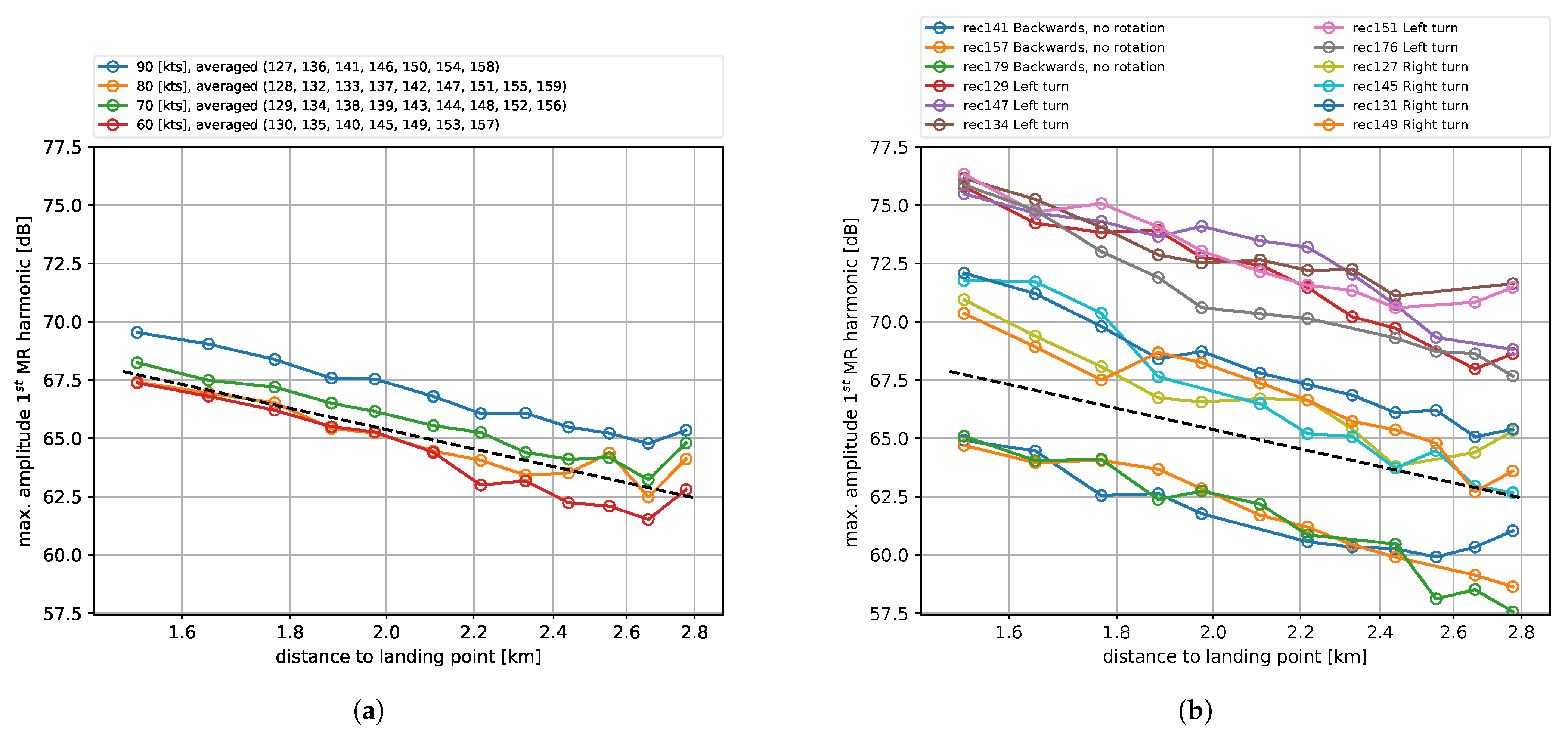 By using the emission times of the maximum amplitudes, the helicopter position and speed at the moment of maximum noise generation can be determined. These data correlate well between different microphones and show that for the approaches at 60 kts, the maxima occur while the helicopter is at the end of the flare, while for other speeds, the maxima are generated during the transition from flight at constant speed to a deceleration. These results are consistent for nearly all microphone locations, which is an indication that no significant atmospheric propagation effects occurred, which is consistent with the very low wind conditions. At an approach speed above 90 kts, it is likely that the maximum noise will be generated during the steady phase of the approach, because of the increase in thickness noise.