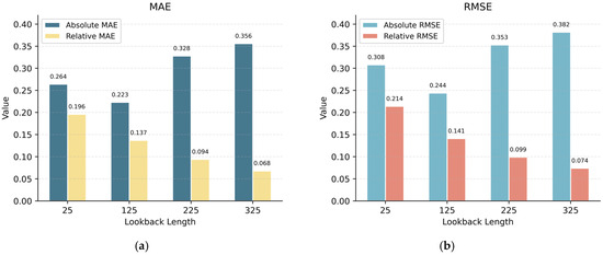 Error comparison between absolute value processing and relative value processing under different lookback lengths (a) MAE; (b) RMSE.