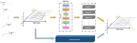 During training, the outputs of multiple pre-trained iInformer models are used as candidates, and the Gating Network optimizes the weight assignment strategy through backpropagation. Let the set of pre-trained iInformer sub-models be (corresponding to different backtracking lengths, e.g., 50, 150, 250, 350), and the Gating Network outputs weights for each sub-model: