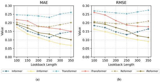 Error comparison of different Transformer-based models under various lookback lengths (a) MAE; (b) RMSE.