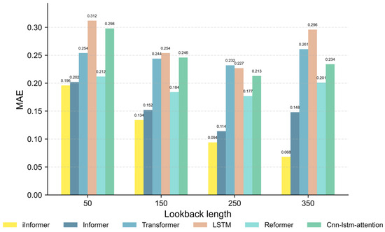 MAE comparison between Gate-iInformer and various common time-series prediction models under different lookback lengths.