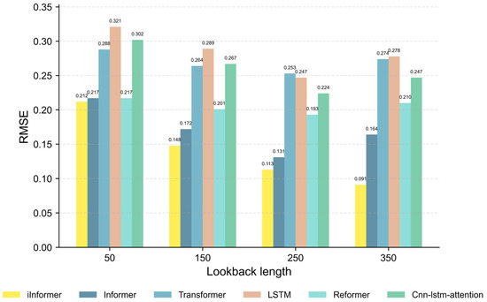 RMSE comparison between Gate-iInformer and various common time-series prediction models under different lookback lengths.