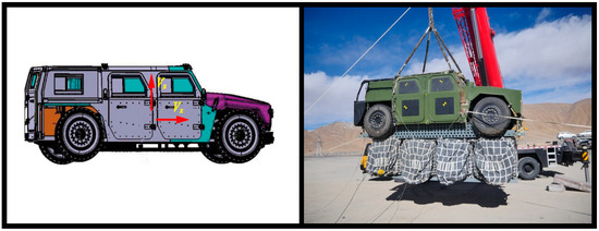For obtaining the magnitude of the terminal impact velocity, a vertical impact test bench is plotted in Figure 1. When fully deployed, the under-vehicle airbag reaches a height of 1.2 m. The weight of the vehicle is 7600 kg and the ground coordinate is defined in Figure 1. In addition, the angle between the vehicle’s heading (longitudinal axis) and its horizontal velocity vector is defined as the sideslip angle (). When the vertical landing impact test bench works, the vehicle is lifted by a cable to a height of 3.2 m and then conducted free fall afterwards to ensure a ground touching speed of about 8 m/s (typical touchdown speed in the airdrop mission).