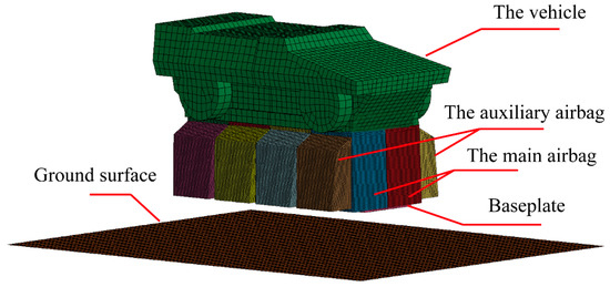 Apart from the above experiment measurement devices, this study also proposes a fluid–structure interaction (FSI) model to simulate the vehicle’s impact process. The buffer airbag of the airdrop system is fixed to the vehicle through the front and rear beams and modeled based on the control volume (CV) method. Since the complex contact model between the buffer system and the vehicle has little impact on the finite element analysis, the front and rear beams of the buffer system are simplified as part of the vehicle model. Also, the impact of the vehicle’s gun barrel on the calculation of airbag buffering process is minimal. Therefore, the gun barrel is deleted for simplicity. At the beginning of the simulation, the height of the base plate from the ground is set to 0.751 m and the vehicle falls freely at an initial speed of 7.02 m/s so that the speed at which the base plate contacts the ground is around 8 m/s. The meshes of the vehicle as well as the airbags are plotted with the Hypermesh 13.0 software as shown in Figure 3. The total cell numbers for the vehicle, airbag, and ground are 500,000.