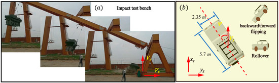 Thus, on one hand, the structure of the oblique impact test bench is plotted in Figure 4. Unlike the experiment instruments in Figure 1, the oblique impact test bench gives the vehicle a horizontal velocity (). The angle between the longitudinal direction and the horizontal velocity vector when the bottom surface of the vehicle touches the ground is defined as the terminal sideslip angle ().
