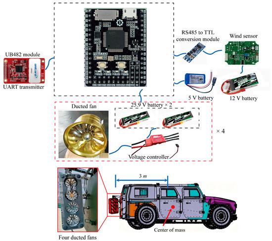 Since the terminal sideslip angles affect the landing attitude stability, it is fundamental to design certain control systems to achieve certain terminal sideslip angles and help increase the landing attitude stability. As shown in Figure 5, the micro controller unit (MCU) used in the control system is the STM32F407 chip manufactured by O1 studio. The wind sensor powered by an independent 12 V battery (manufactured by GT electronics technology) is connected to the MCU through transistor-transistor logic (TTL) serial communication, while the UB 482 module used to obtain the high precision orientation of the vehicle is connected to the MCU through UART port. The GPS receiver embedded in UB 482 module can receive satellite signals and calculate the current position and velocity of the vehicle in real time to provide initial position information and gyro drift correction; magnetometers embedded in UB 482 module can be used for initial heading alignment and gyro heading drift correction.