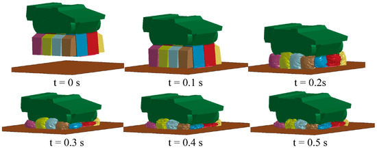 By using the simulation model built up by LS-DYNA R13 software, as depicted in Figure 3, the vehicle’s airbag cushioning process is simulated and plotted in Figure 6. As shown in Figure 6, the bottom of the airbag touches the ground when t = 0.1 s and significant airbag leakage is observed at 0.3 s. Upon the time exceeding 0.4 s, the main airbags are almost empty despite there still being some compressed gas within the auxiliary airbag.