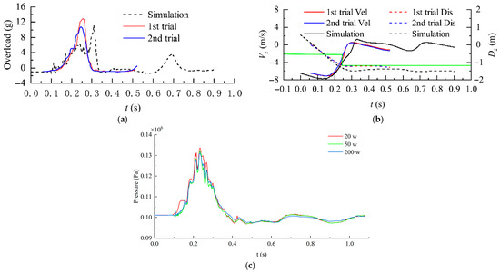 Based on the test instruments introduced in Figure 1, two vertical falling tests are also included, as shown in Figure 7. The peak overloads in the first trial and the second trial are 12.9 g and 10.8 g, respectively. The differences between the simulated peak overload and experimental overloads are −13.2% and 3.7%. Obviously, from the peak overloads, the experiment results prove the reliability of the FSI buffering simulation model built up in this study. It is apparent that the experimental curves and simulation curves show similar trend despite the experimental peak overloads occurring earlier. According to the experiment results in Figure 7, the vehicle collides with the ground when t = 0.25 s. At that time, the displacement of vehicles was −1.2 m (equal to the height of the under-vehicle airbag) and the downward velocity is about 2 m/s. Thus, the terminal impact velocity is obtained as 2 m/s. By comparing the pressure inside the single airbag, the grid impendence study is conducted as shown in Figure 7c. According to Figure 7c, the curves of the pressure inside the single airbag obtained by 50 w cells and 200 w cells show good consistency, which means 50 w cells are enough for the fluid–structure-interaction simulation.
