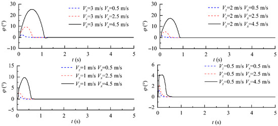 Although the terminal impact velocity is 2 m/s according to the experiment in Section 3.1, in the rigid collision stage, the randomness may cause a small range of variation in the initial descent velocity around 2 m/s. Thus, it is important to analyze the effect of the initial descent velocity () on the roll stability of the vehicle. In this analysis, the initial descent velocity () ranges from 0.5 m/s to 3 m/s while the initial horizontal velocity () ranges from 0.5 m/s to 4.5 m/s as shown in Figure 8. For all the cases in Figure 8, the terminal sideslip angle () are set as 90°. According to Figure 8, it is observed that the increase in the initial descent velocity can increase the peak roll angles increase and reduce the roll stability of the vehicle. Also, the peak roll angles increase dramatically with the increase in the initial horizontal velocity. When the initial horizontal velocity is as small as 0.5 m/s, the roll angle peaks stay at nearly zero. This means the initial horizontal velocity is the most important factor affecting the roll stability of the vehicle.