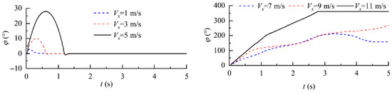 Thus, in the next step, the effect of the initial horizontal velocity () on the roll stability of the vehicle tries to be uncovered through simulation results. The terminal sideslip angle () is set as 90° for all cases in Figure 9. It is found that the peak roll angle grows to about 30° when the initial horizontal velocity is 5 m/s. If further increasing the initial horizontal velocity to 7 m/s, the vehicle starts to rollover. The roll angle continues growing to about 200° before it decreases. Upon the initial horizontal velocity () even increases to 11 m/s, the vehicle can complete a 360° rollover.