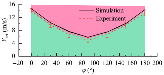 To verify the reliability of the dynamic simulation analysis mentioned above, several experiments are conducted to test the critical initial horizontal velocity under 90° terminal sideslip angles based on the system provided in Section 2.2. In the experiment, if the vehicle rolls over 4 out of 7 repetitions at a certain initial horizontal velocity, it is considered that the vehicle will roll over at that speed. It is noted that the critical horizontal velocities at all sideslip angles are tested once a day and the whole test lasts for 5 days. Then, for each case, the average critical horizontal velocity is calculated according to the 5 days experiment results and dotted in Figure 10. In addition, the error bars are also given in Figure 10. From Figure 10, it is found that the experimental data exhibits excellent agreement with simulation results. Also, the critical horizontal velocity is almost tripled from about 5.3 m/s to 14.7 m/s if adjusting the terminal sideslip angle from 90° to 0°/180°.