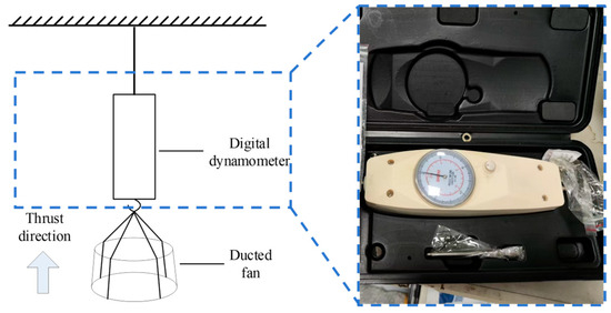 where stands for the moment of inertia, means the angular velocity perpendicular to the ground in radians/second, and are the length and width of the vehicle, as shown in Figure 4. Based on Equations (4) and (5), in order to achieve an angular velocity () of 1.25 revolutions per minute within 6 s for the airdrop system, the required moment (M) can be calculated as . Since the distance between the duct fan center and the vehicle’s center of gravity is , as shown in Figure 5, the required thrust of the ducted fan is around 175 N. A TP5670 480 KV motor is used to drive the 150 mm ducted fan with 10 kg maximum thrust. Thus, two ducted fans are used to generate the needed 175 N thrust. The relationship between the current and thrust of the customized 150 mm ducted fan (improved based on the JP EDF120mm ducted fan) was tested using the digital dynamometer (NK-200), as shown in Figure 11 and Table 4. When lifting the vehicle off the ground and activating the maximum thrust, it is found that the vehicle turns 90 ° after 12 s.