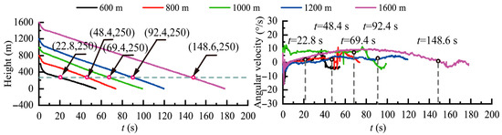 wherein, the and parameters are set as 5 and 8, respectively, stands for the ducted fan’s rotation speed in revolutions per minute (RPM). Then, the complete airdrop tests are conducted with the initial airdrop heights are set as 600 m, 800 m, 1000 m, 1200 m, and 1600 m. The terminal sideslip angle active control system starts to work when the vehicle descents to 250 m height. According to Figure 12, during the whole airdrop process, the angular velocity stays at a relatively low level and its magnitude can be kept within about ±15° under the help of the terminal sideslip angle active control system.