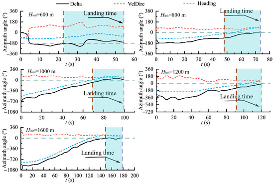 When it comes to the variation trend of the vehicle’s longitudinal axis at the landing time as shown in Figure 13, it can be observed that the angles between the vehicle’s horizonal velocity vector and its longitudinal axis get quite close to 0°/180° whatever the initial airdrop height is. Also, the initial height would lengthen the total airdrop time and the terminal sideslip angle active control system works for about 30 s in each airdrop case as shaded in light blue. In fact, shifting the center of mass of the vehicle assembly may improve the effectiveness of the yaw steering contraption. We will study that in our next work.