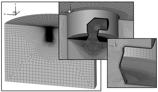 A grid independence study was conducted by comparing solutions obtained using meshes ranging from 3 million to 8 million cells. The results indicated that variations in the nozzle pressure gradient were below 1%. Consequently, a T-Rex boundary layer unstructured grid comprising 5.23 million cells was selected. The near-wall grid was refined to ensure y+ values remained below 1, enabling proper resolution of the viscous sublayer and accurate prediction of wall-bounded effects. This final grid configuration was chosen to achieve an optimal balance between solution accuracy and computational efficiency [31,32]. The overall grid topology and a detailed view of the boundary layer region are presented in Figure 3.