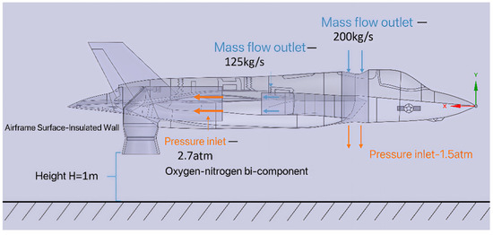 The aircraft model has a length of 19.45 m, wingspan of 13.32 m, and height of 4.46 m. The upper lift fan features a circular inlet with a diameter of 1.36 m and depth of 1.02 m, while the lower lift fan employs a rectangular outlet measuring 0.96 m × 0.87 m × 0.80 m (length × width × depth). The engine pressure inlet is circular (diameter: 1.06 m), and the nozzle section is circular (diameter: 1.016 m). The nozzle lower edge is positioned 1.0 m above ground level. Boundary conditions for the full configuration are detailed in Figure 5.