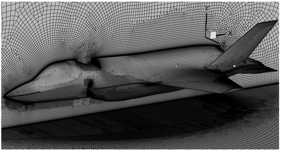 The full-configuration aircraft was meshed using a similar unstructured grid topology to the isolated nozzle case, resulting in a total cell count of approximately 12 million cells, as depicted in Figure 6. The boundary layer was carefully resolved using prism layers to maintain a y+ value of less than 1 on all critical aircraft surfaces, including the fuselage, wings, and control surfaces, ensuring accurate modeling of the near-wall flow physics.