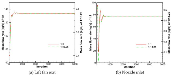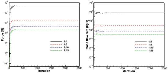 Simulations were performed for geometrically scaled nozzle models at ratios of 1:1, 1:5, 1:10, and 1:15. Residual histories of the vertical axial force and inlet mass flow rate monitored during mid-simulation are presented in Figure 7. The figure demonstrates minimal variation in monitored flow parameters beyond this computational stage, confirming solution convergence.