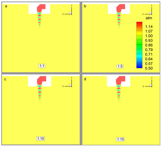 Comparative Pressure contours on symmetry planes of scaled test models: (a) Scale 1:1; (b) Scale 1:5; (c) Scale 1:10; (d) Scale 1:15.