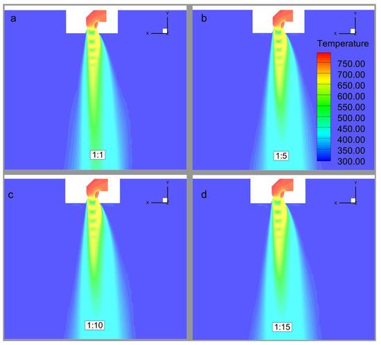Comparative Temperature contours on symmetry planes of scaled test models: (a) Scale 1:1; (b) Scale 1:5; (c) Scale 1:10; (d) Scale 1:15.