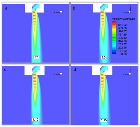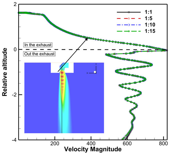 To provide a more quantitative assessment of the flow field similarity, Figure 11 presents the velocity magnitude along the jet centerline for all scaled models. The results show a remarkable collapse of the data, with all four scaling ratios producing nearly identical velocity profiles. The characteristic oscillations in velocity correspond to the shock-cell structure typical of an under-expanded jet. The fact that the location, magnitude, and decay rate of these shock cells are preserved across all scales provides strong quantitative evidence that the fundamental compressible flow physics are correctly captured by the scaling approach.