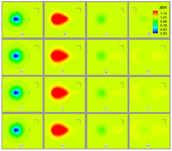 Comparative Pressure contours at cross-sections downstream of nozzle exit for scaled test models: (a–d) Scale 1:1 model at (a) 0D, (b) 1D, (c) 2D, (d) 3D; (e–h) Scale 1:5 model at (e) 0D, (f) 1D, (g) 2D, (h) 3D; (i–l) Scale 1:10 model at (i) 0D, (j) 1D, (k) 2D, (l) 3D; (m–p) Scale 1:15 model at (m) 0D, (n) 1D, (o) 2D, (p) 3D.