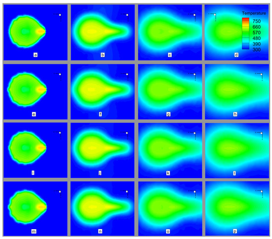 Comparative Temperature contours at cross-sections downstream of nozzle exit for scaled test models: (a–d) Scale 1:1 model at (a) 0D, (b) 1D, (c) 2D, (d) 3D; (e–h) Scale 1:5 model at (e) 0D, (f) 1D, (g) 2D, (h) 3D; (i–l) Scale 1:10 model at (i) 0D, (j) 1D, (k) 2D, (l) 3D; (m–p) Scale 1:15 model at (m) 0D, (n) 1D, (o) 2D, (p) 3D.