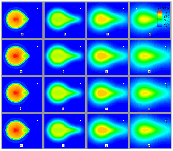Comparative Velocity contours at cross-sections downstream of nozzle exit for scaled test models: (a–d) Scale 1:1 model at (a) 0D, (b) 1D, (c) 2D, (d) 3D; (e–h) Scale 1:5 model at (e) 0D, (f) 1D, (g) 2D, (h) 3D; (i–l) Scale 1:10 model at (i) 0D, (j) 1D, (k) 2D, (l) 3D; (m–p) Scale 1:15 model at (m) 0D, (n) 1D, (o) 2D, (p) 3D.