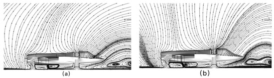 Figure 18 presents symmetrical-plane flow patterns for both scale models. The lift fan’s cold downward jet impinges on the ground and deflects rearward, while the nozzle’s hot downward jet impinges and deflects forward. These flows merge approximately 1/3 chord lengths ahead of the nozzle–lift fan axis, subsequently developing into an upward fountain flow. This fountain transports heated fluid toward the aircraft underside, inducing thermal loading. Streamline topology demonstrates exceptional similarity between scale models, validating scaled-model fidelity for flow structure simulation [42].