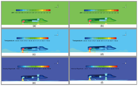 Comparative flow field distributions on symmetry planes of scaled test models: (a,b) Pressure contours: (a) Scale 1:1, (b) Scale 1:13.25; (c,d) Temperature contours: (c) Scale 1:1, (d) Scale 1:13.25; (e,f) Velocity contours: (e) Scale 1:1, (f) Scale 1:13.25.