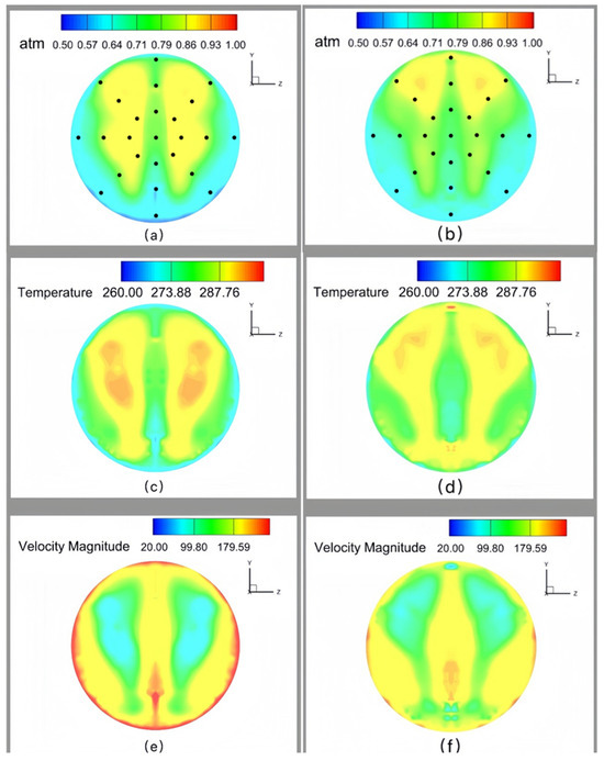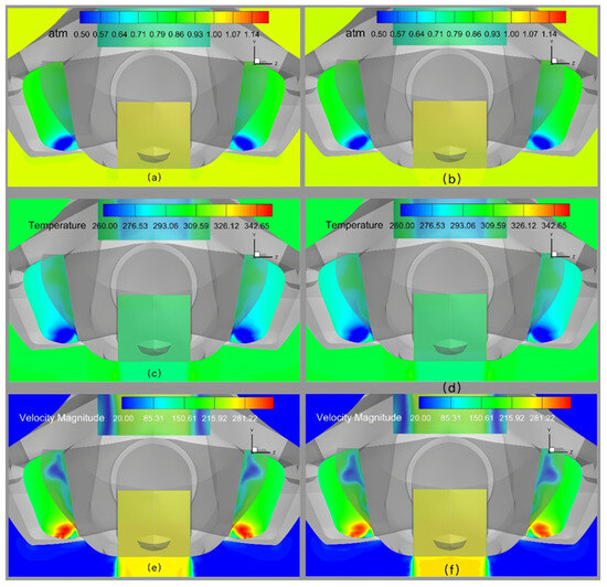 Figure 19 presents symmetrical-plane contour distributions of pressure, temperature, and velocity simulated with different turbulence models. Results demonstrate close agreement between scaling conditions in