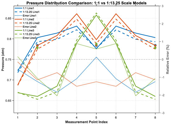 Pressure and Relative Error ((Pscaled − Pfull)/Pfull) Distribution Comparison at Intake Outlet: 1:1 vs. 1:13.25 Scale Models.