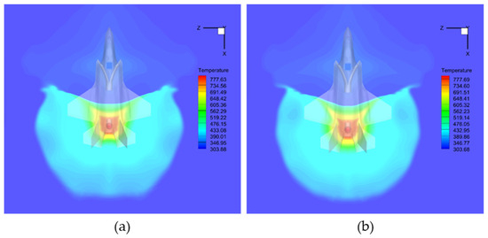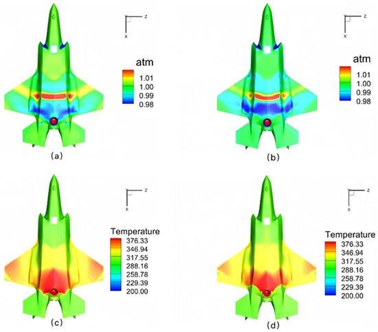 Comparative ventral surface flow characteristics of scaled test models: (a,b) Pressure contours: (a) Scale 1:1, (b) Scale 1:13.25; (c,d) Temperature contours: (c) Scale 1:1, (d) Scale 1:13.25.