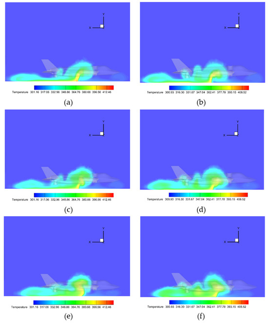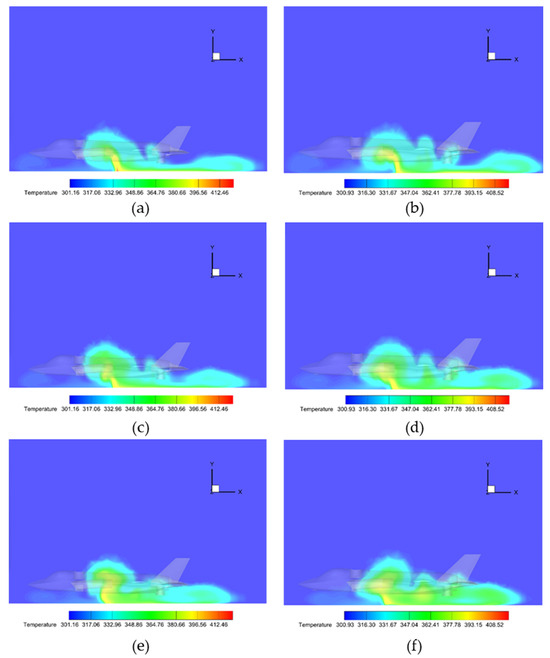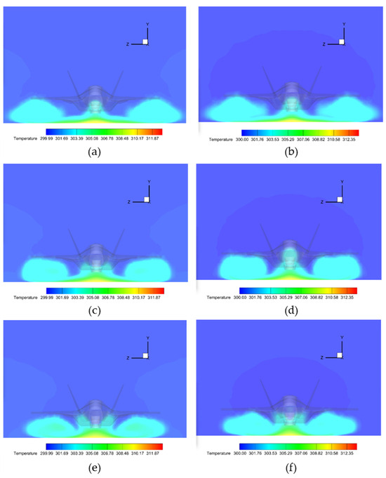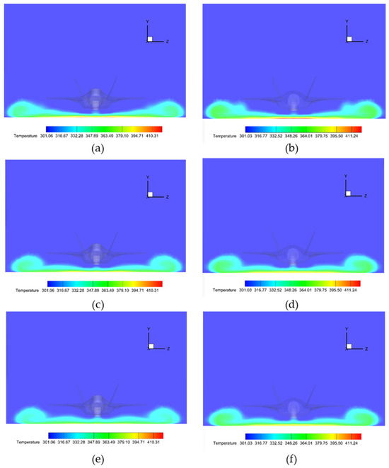 Comparative temperature distributions on vertical planes at aft distances from scaled test models: (a,b) 1 m plane: (a) Scale 1:1, (b) Scale 1:13.25; (c,d) 2 m plane: (c) Scale 1:1, (d) Scale 1:13.25; (e,f) 3 m plane: (e) Scale 1:1, (f) Scale 1:13.25.