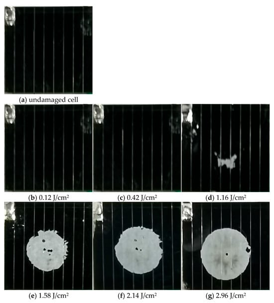 The GaAs solar cell with a surface size of 10 × 10 mm was irradiated by a laser beam with a diameter of approximately 5 mm, a wavelength of 1064 nm, and a pulse width of 10 ns. The laser energy density was varied by changing the energy of the laser. All solar cell samples were obtained from the same production batch to ensure consistency. Prior to laser irradiation and spectral measurement, each cell was cleaned using an ultrasonic cleaner with ethanol to remove surface contaminants. Laser energy densities of 0.12, 0.42, 1.16, 1.58, 2.14, and 2.96 J/cm2 were used to irradiate the cells, causing visible damage on the surface. As shown in Figure 1, when the irradiation laser energy density is 0.12 and 0.42 J/cm2, there is no significant change on the surface of the cell; however, when the irradiation laser energy density is 1.16 J/cm2, damage is observed on the surface, with some silver-colored ablative areas appearing at the irradiation site. With the increase in laser energy density, the damage becomes more pronounced, as seen when the irradiation laser energy densities are 1.58, 2.14, and 2.96 J/cm2, where distinct damage areas are visible.
