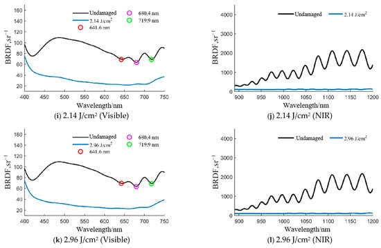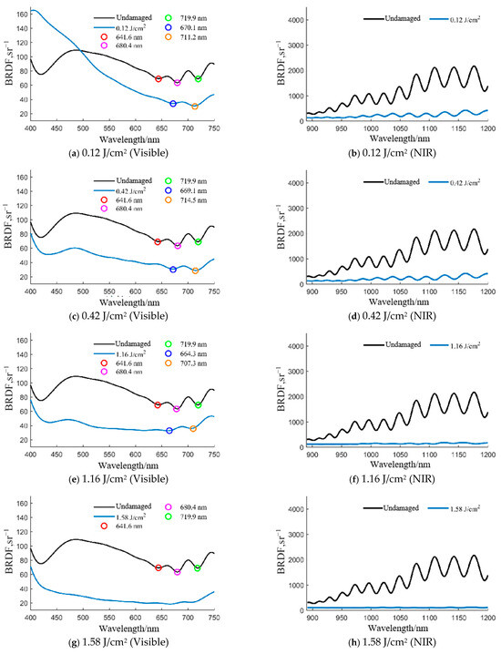 The BRDF curves of the solar cells irradiated with different laser energy densities are shown in Figure 3. When the laser energy density is 0.12 and 0.42 J/cm2, the BRDF of the visible and near-infrared spectral ranges of the cell are shown in Figure 3a–d. Under pulsed laser irradiation, the number of absorption peaks in the 600–750 nm visible spectral range decreases, and the amplitude of absorption peaks weakens compared to the original intact cell. The amplitude of the curve in the near-infrared spectral range also decreases, but oscillation phenomena persist. When the laser energy density is 1.16 J/cm2, damaged areas appear on the cell surface. The amplitude of absorption peaks significantly decreases, and the oscillation phenomena in the near-infrared spectral range disappear. With further increase in laser energy density (1.58, 2.14, and 2.96 J/cm2), the degree of cell damage intensifies, leading to a significant decrease in the curve amplitude in the visible spectral range, disappearance of absorption peak characteristics in the visible wavelength range, and complete disappearance of oscillation in the near-infrared spectral range.