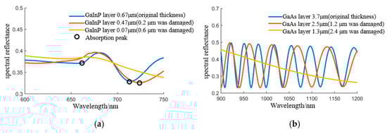 Impact of variations in the thickness of the GaInP and GaAs layers on the spectral reflectance characteristics. (a) GaInP layer (b) GaAs layer.