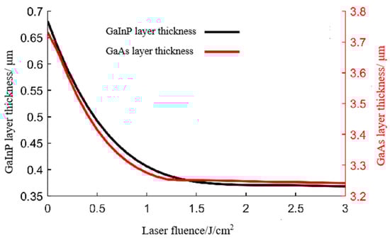 Utilizing the changes in the thickness of the GaInP layer and the GaAs layer of the solar cell to characterize the damage, the laser-induced thickness changes in the GaInP layer and the GaAs layer were obtained through simulations of various conditions based on scattering spectroscopy measurement data. Figure 5 shows the characteristics of the GaInP layer and GaAs layer thickness changes caused by variations in laser energy densities. The horizontal axis represents the laser energy density, the left vertical axis represents the GaInP layer thickness, and the right vertical axis represents the GaAs layer thickness. The black line represents the change in GaInP layer thickness, and the red line represents the change in GaAs layer thickness.