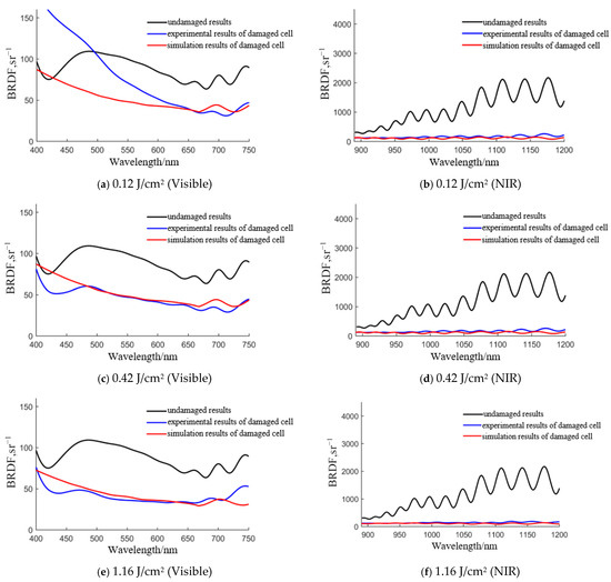 Based on the thickness changes obtained from Figure 5, further simulations were conducted to obtain the BRDF changes in the solar cell after irradiation with different laser energy densities, which were then compared with measurement results, as shown in Figure 6. The black line in the figure represents the measurement BRDF of the original intact cell, the blue line represents the measurement BRDF of the irradiated damaged cell, and the red line represents the simulated results. A visual comparison reveals that the simulated spectral curves capture the key experimental trends, namely the reduction in the number of visible-range absorption peaks and the damping of near-infrared oscillations with increasing laser energy density. When the irradiation laser energy density is less than 1.16 J/cm2, the absorption peaks in the visible spectrum range and the oscillation in the near-infrared spectral range still exist as the laser energy density increases, with only changes in amplitude, indicating minimal damage to the GaInP and GaAs layers. When the irradiation laser energy density is greater than 1.58 J/cm2, the amplitude of the visible light spectrum curve decreases significantly with increasing laser energy density, making it difficult to observe absorption peaks. At the same time, the oscillation curve in the near-infrared spectral range disappears completely, reflecting significant damage to the GaInP and GaAs layers of the cell. These spectral changes occur because when a 1064 nm wavelength nanosecond pulsed laser irradiates a triple-junction GaAs solar cell, the photon energy of the laser does not reach the bandgap widths of the top GaInP layer and middle GaAs layer of the cell, allowing the laser to penetrate through the GaInP and GaAs layers to reach the Ge layer. Nanosecond pulsed lasers have extremely high peak power densities, causing the GaAs layer adjacent to the Ge layer to be damaged first, leading to the gradual disappearance of the oscillation in the near-infrared spectral range. With increasing laser energy density, i.e., when the laser energy density is greater than 1.58 J/cm2, the damage to the GaAs layer adjacent to the Ge layer increases due to the high peak power density of the acting laser, as well as a gradual expanding increase in damage to the GaInP layer, resulting in the visible light absorption peak characteristics tending to disappear in the scattered spectrum features.