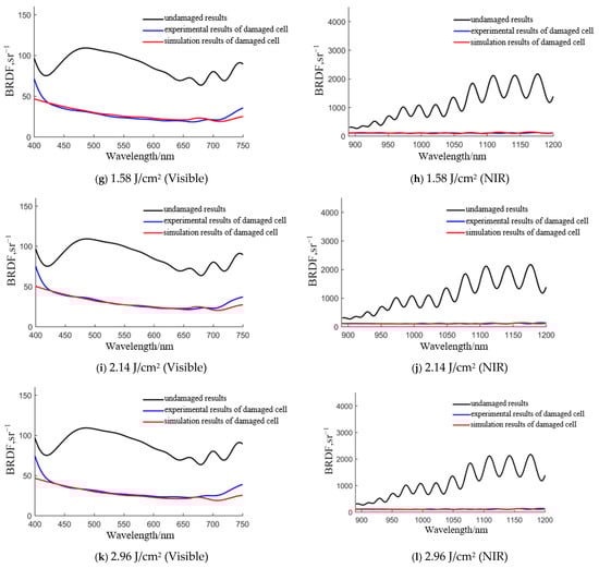 Comparison of the simulation results and experimental measurements of the cell’s BRDF irradiated under different laser densities. For each energy density, the left panel (a,c,e,g,i,k) shows the spectral characteristics in the visible range (400–750 nm), while the right panel (b,d,f,h,j,l) shows the corresponding characteristics in the near-infrared range (900–1200 nm).