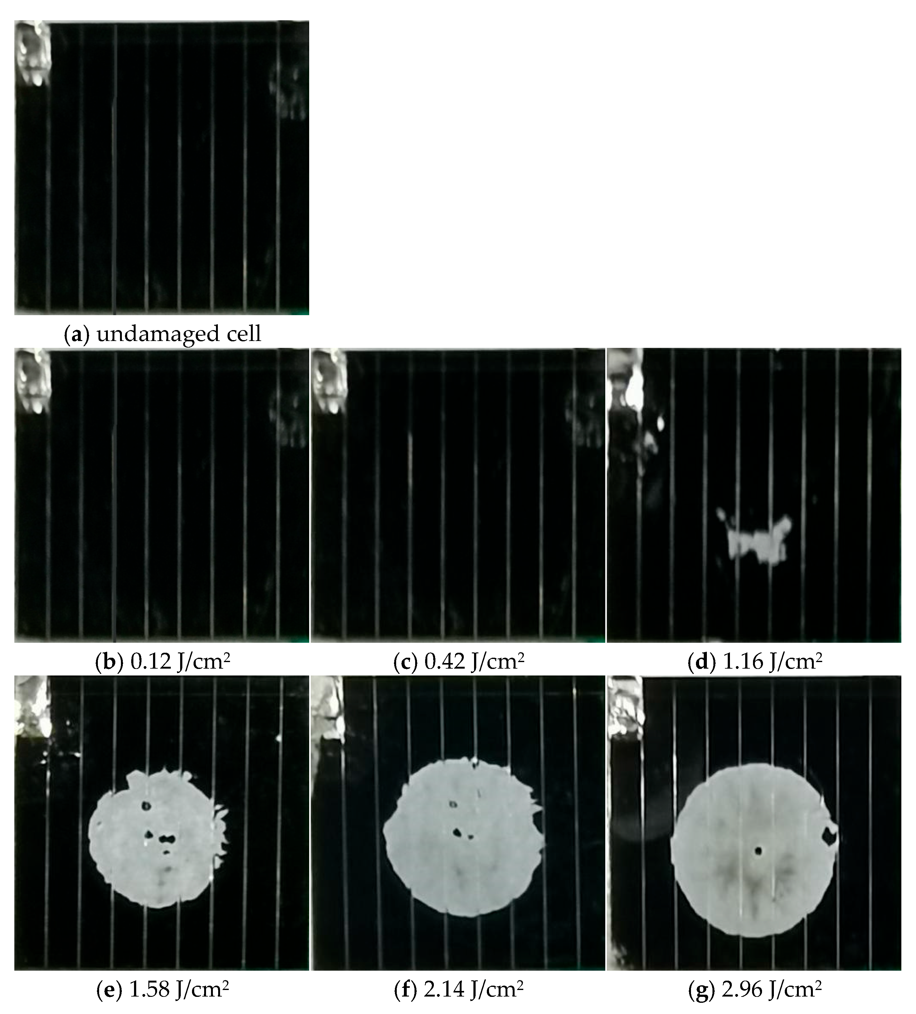 The GaAs solar cell with a surface size of 10 × 10 mm was irradiated by a laser beam with a diameter of approximately 5 mm, a wavelength of 1064 nm, and a pulse width of 10 ns. The laser energy density was varied by changing the energy of the laser. All solar cell samples were obtained from the same production batch to ensure consistency. Prior to laser irradiation and spectral measurement, each cell was cleaned using an ultrasonic cleaner with ethanol to remove surface contaminants. Laser energy densities of 0.12, 0.42, 1.16, 1.58, 2.14, and 2.96 J/cm