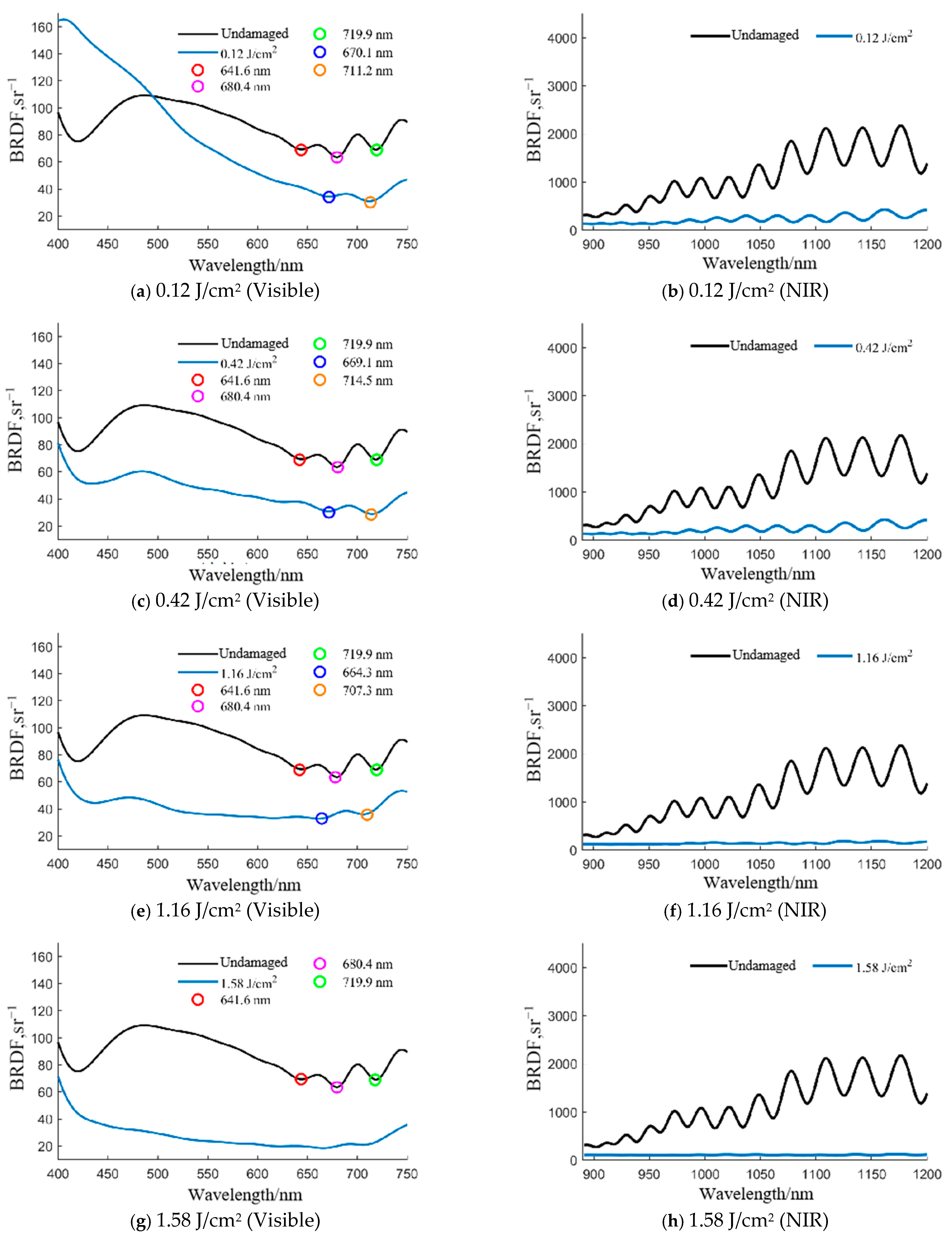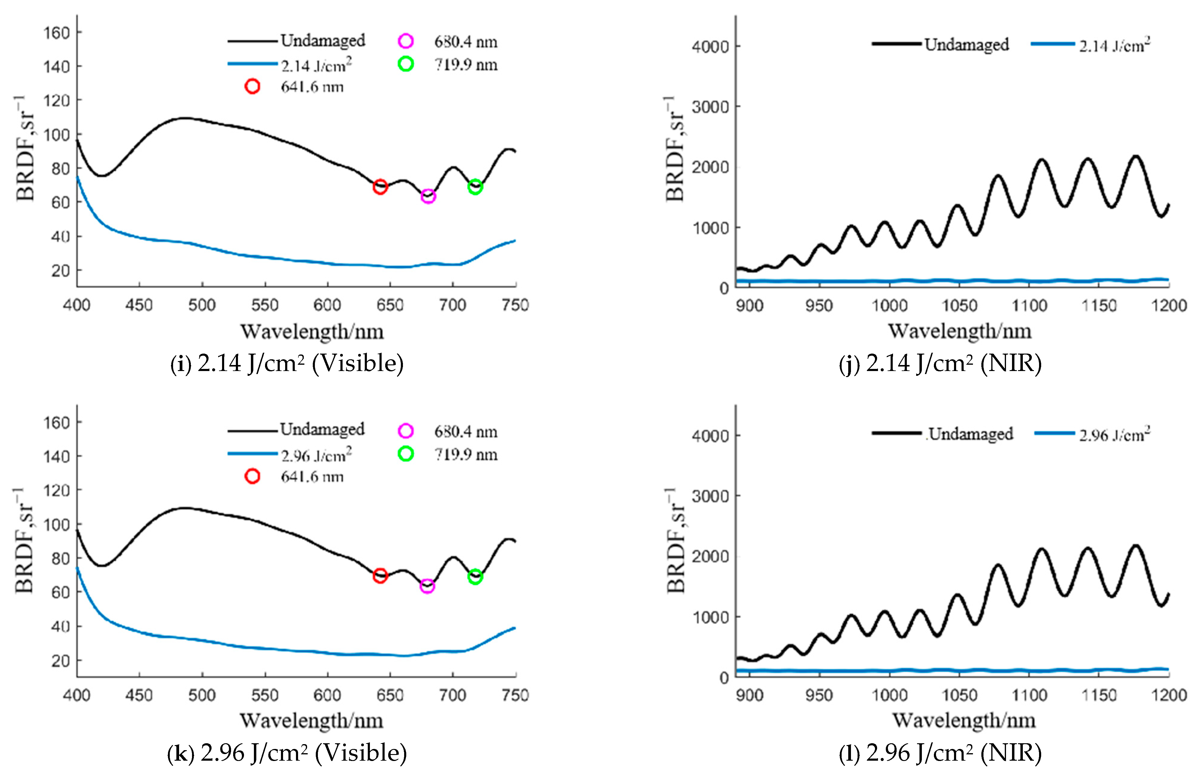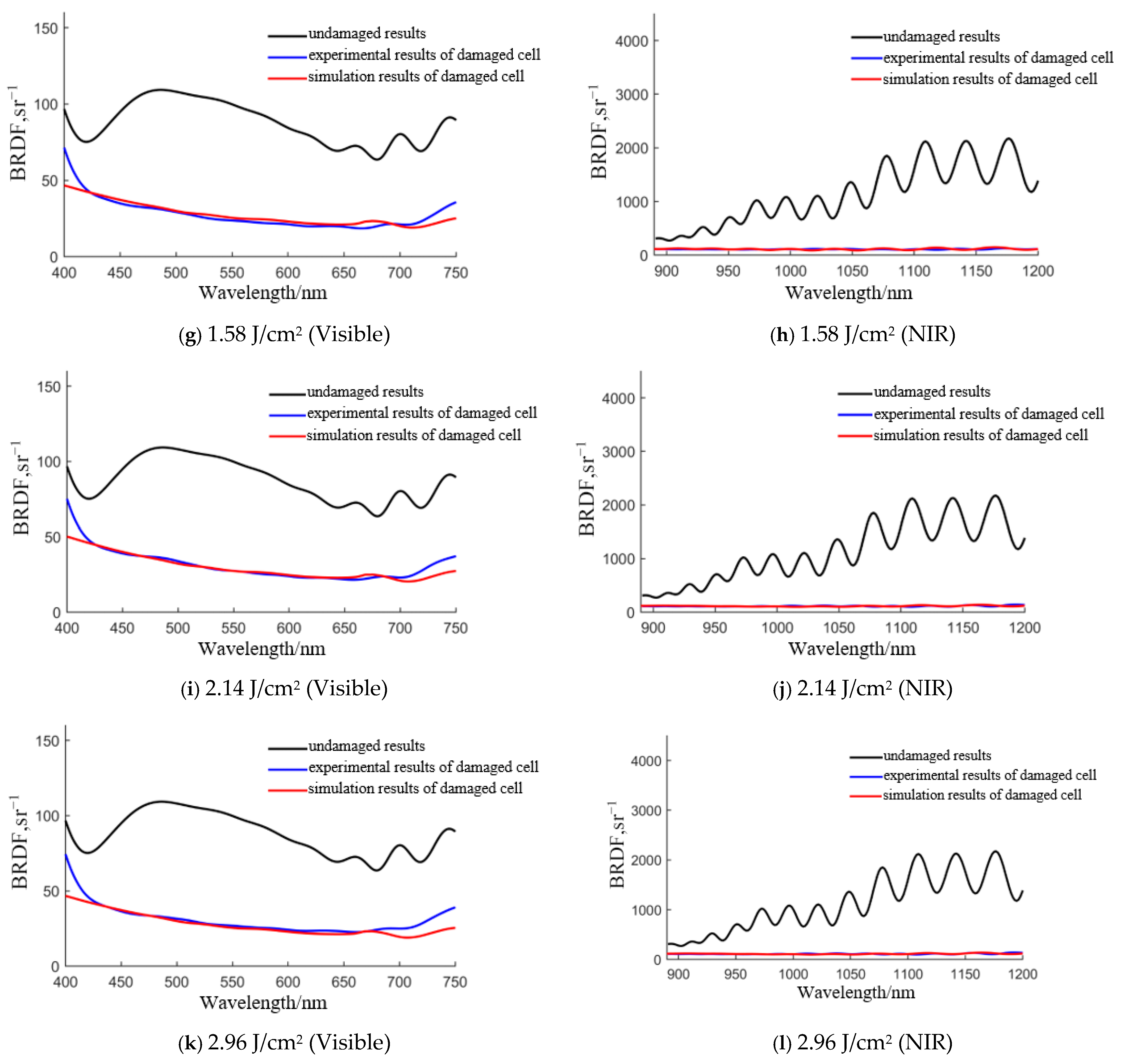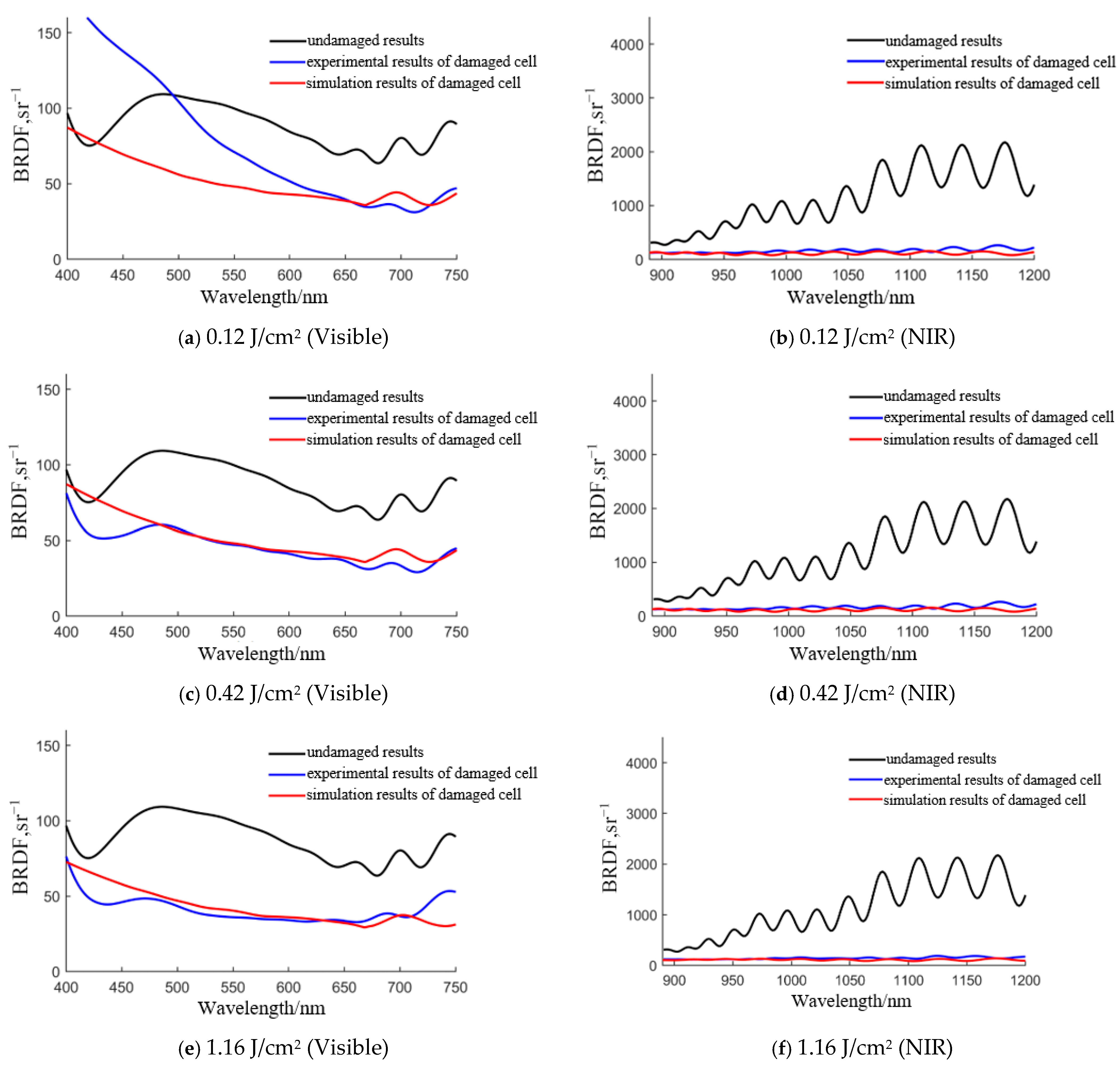 Figure 6. The black line in the figure represents the measurement BRDF of the original intact cell, the blue line represents the measurement BRDF of the irradiated damaged cell, and the red line represents the simulated results. A visual comparison reveals that the simulated spectral curves capture the key experimental trends, namely the reduction in the number of visible-range absorption peaks and the damping of near-infrared oscillations with increasing laser energy density. When the irradiation laser energy density is less than 1.16 J/cm