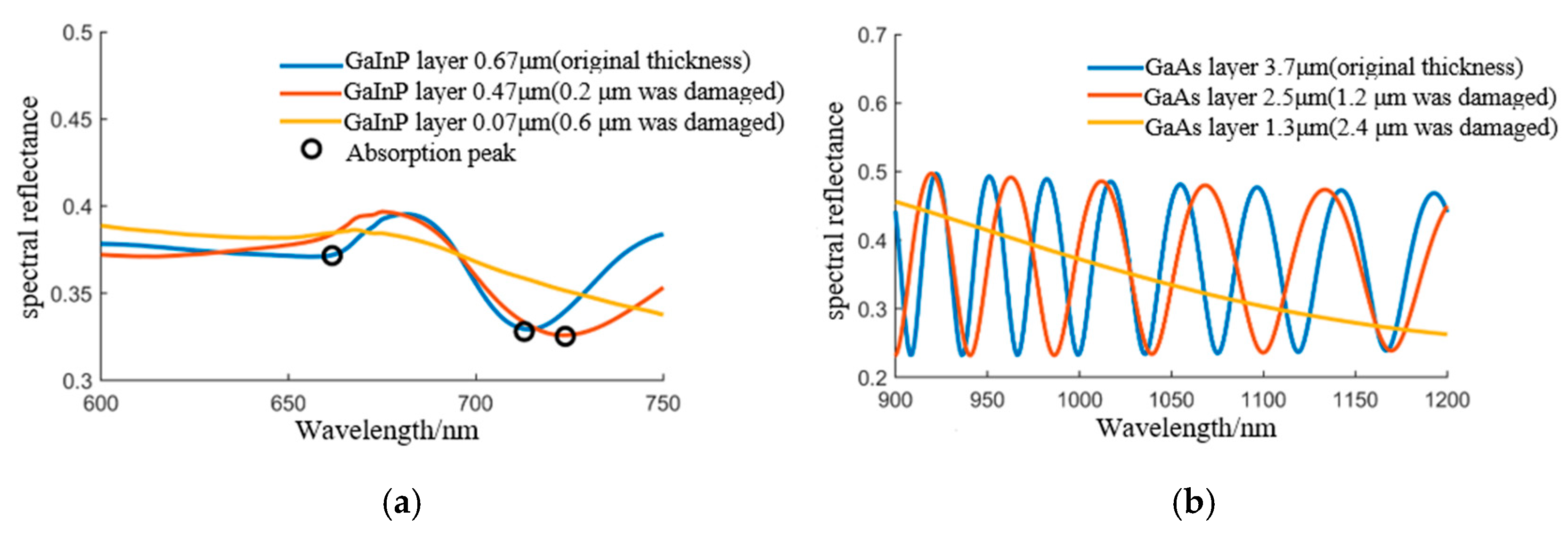 Figure 4, it can be seen that, when the GaInP layer is intact (original thickness is 0.67 μm), there are three absorption peaks in the visible spectrum range of 600~750 nm; and when the GaAs layer is intact (original thickness is 3.7 μm), there are oscillations in the near-infrared spectrum range. As the thickness of the GaInP layer decreases, the number of absorption peaks in the visible spectrum range decreases, and the peak amplitude decreases; for example, when the GaInP layer’s laser damage thickness decreases to 0.47 μm, only one absorption peak is visible in the visible light range. When the laser damage thickness decreases to 0.07 μm, the absorption peak in the visible light range completely disappears. Similarly, as the thickness of the GaAs layer decreases, the oscillation gradually disappears.