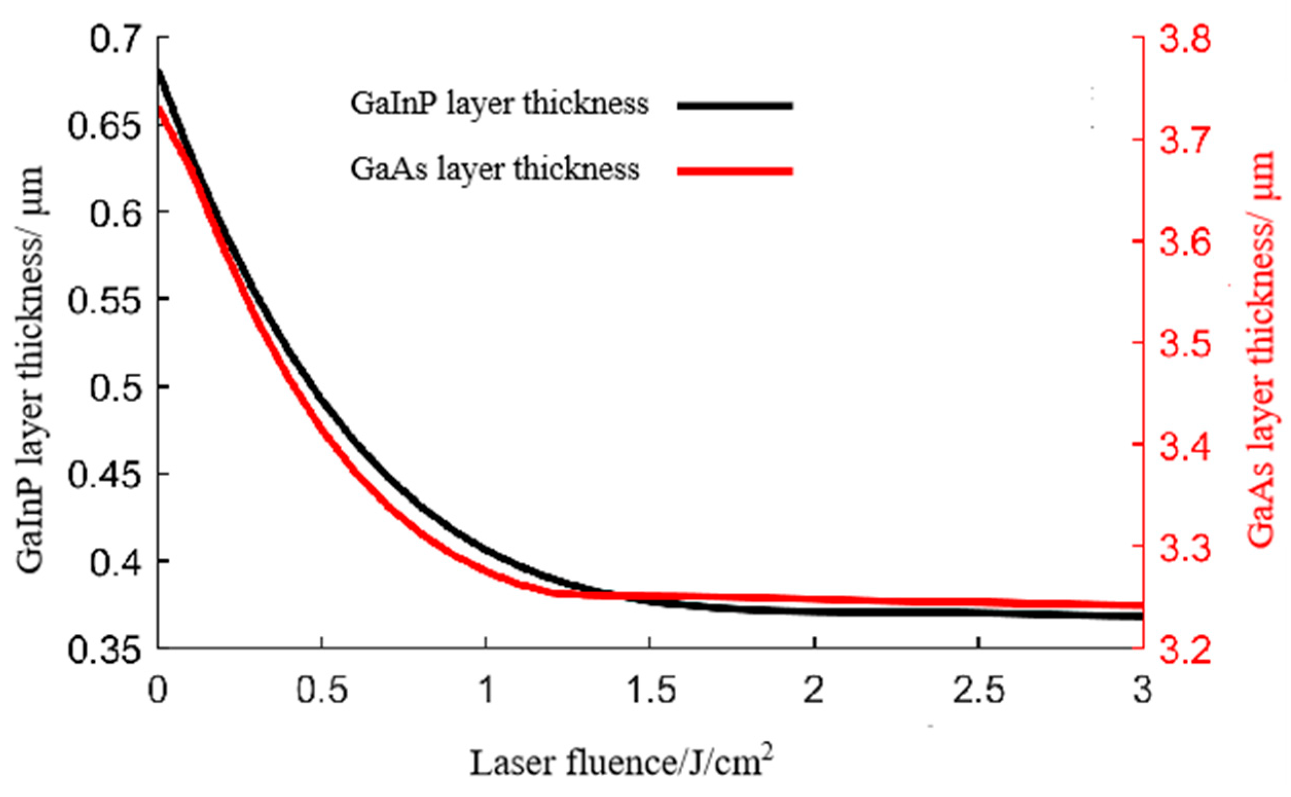 Figure 5 shows the characteristics of the GaInP layer and GaAs layer thickness changes caused by variations in laser energy densities. The horizontal axis represents the laser energy density, the left vertical axis represents the GaInP layer thickness, and the right vertical axis represents the GaAs layer thickness. The black line represents the change in GaInP layer thickness, and the red line represents the change in GaAs layer thickness.