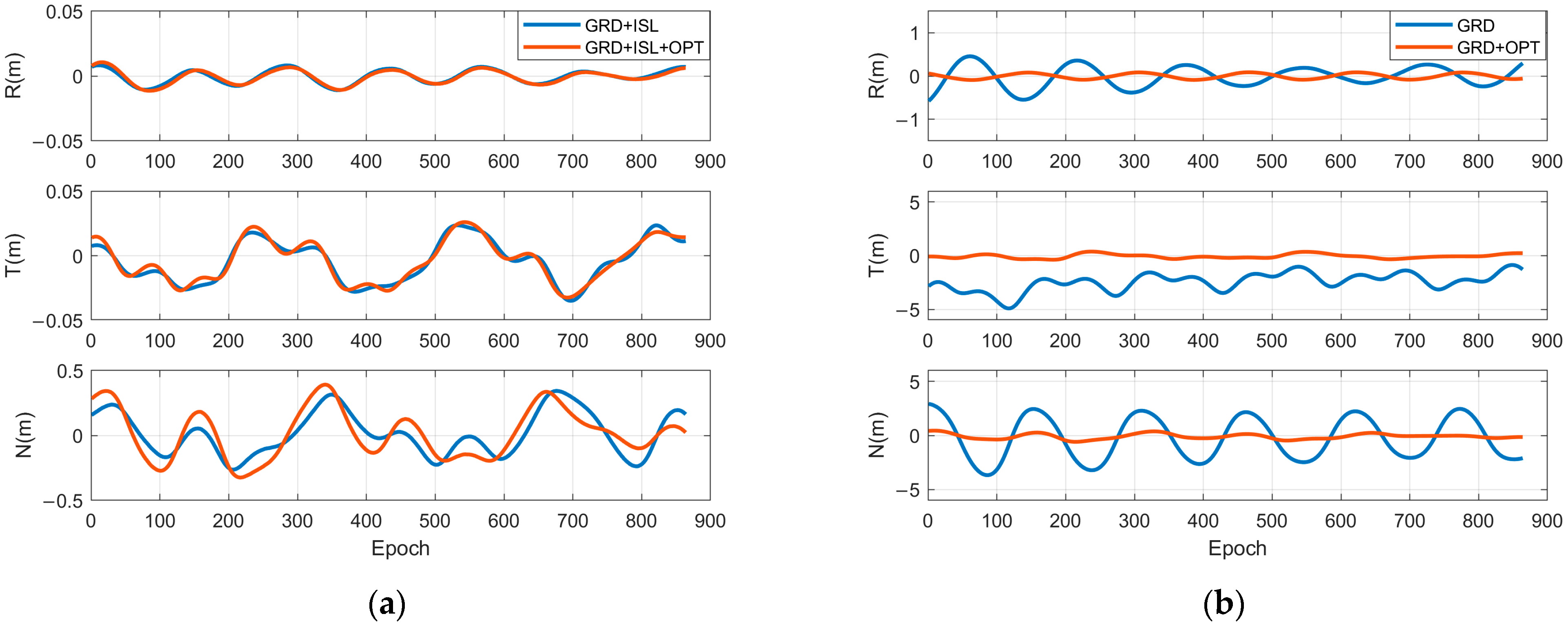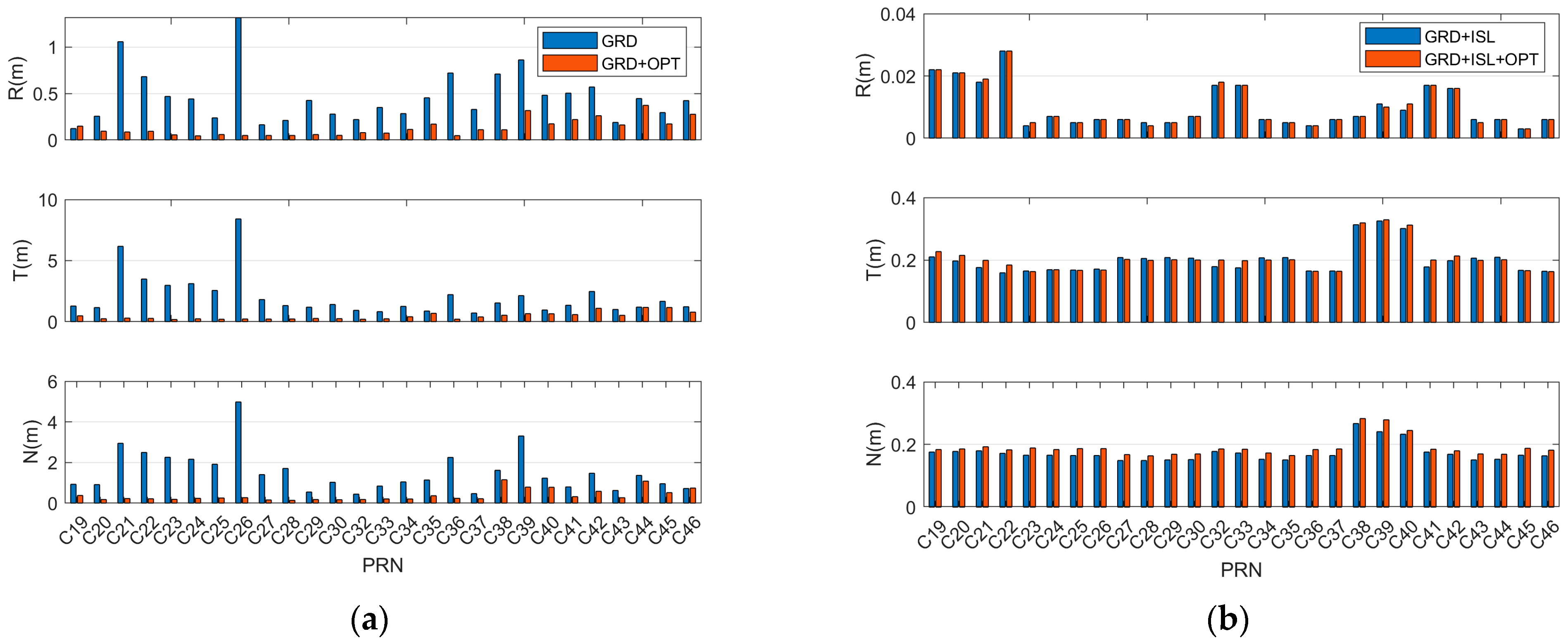 Figure 3 illustrates the changes in orbit determination accuracy for satellite C25 following the incorporation of orientation measurement data, offering a more intuitive understanding of the role of orientation observations in enhancing BeiDou satellite orbit precision. In the comparison between GRD and GRD + OPT, the inclusion of orientation data leads to significant improvements across the radial, tangential, and normal components. In contrast, when comparing GRD + ISL with GRD + ISL + OPT, the orientation data primarily enhance accuracy in the normal direction, with comparatively minor effects on the radial and tangential components.