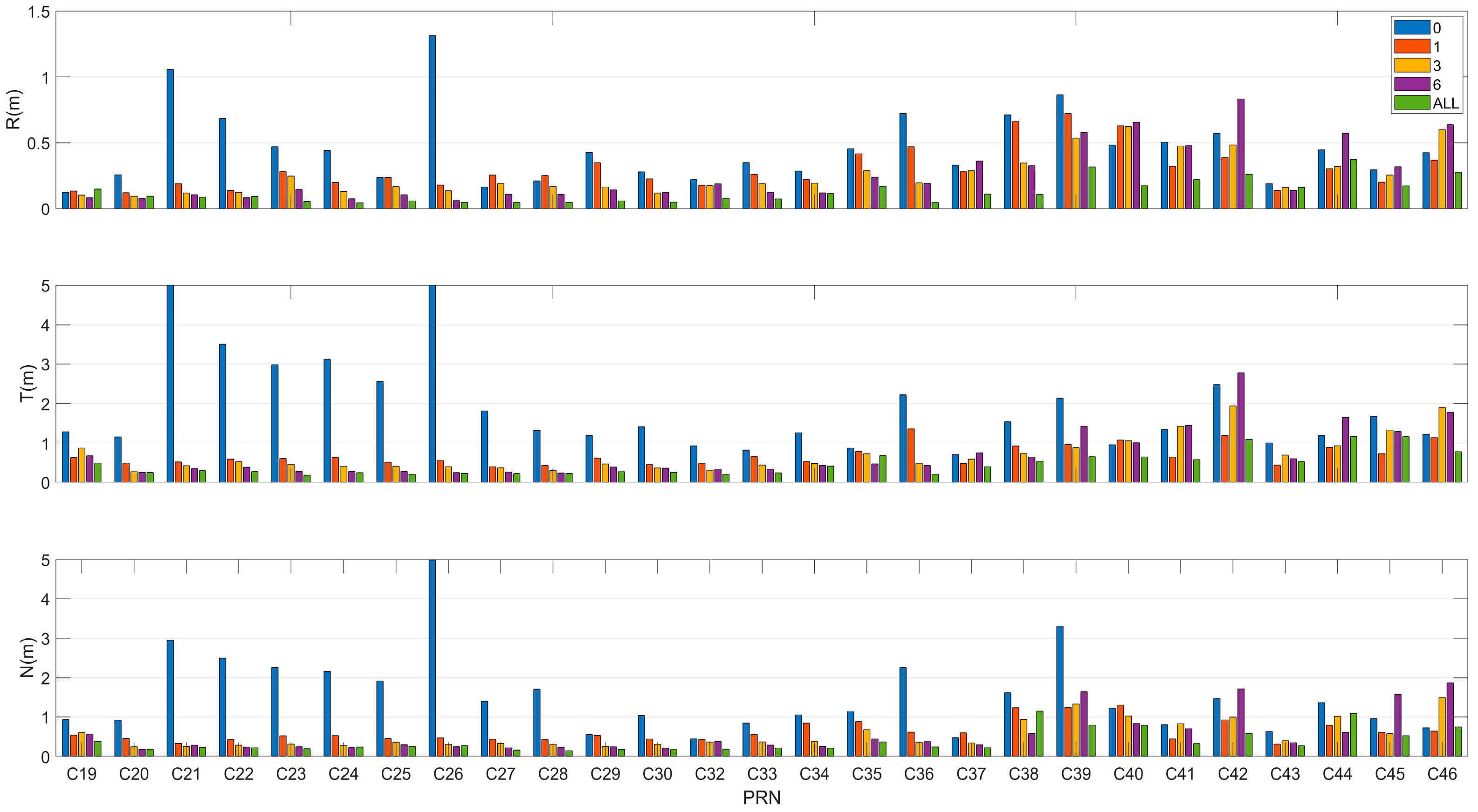 Figure 7 presents the radial, tangential, and normal orbit determination results of satellite C25, which are supported by data from different observation modes.