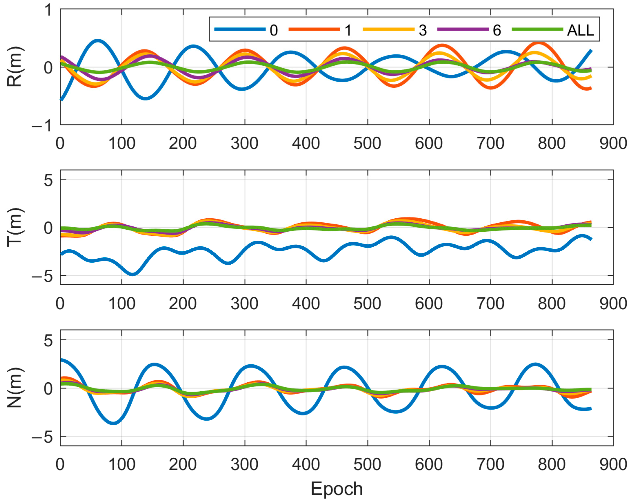 Figure 5 displays the radial, tangential, and normal orbit determination results for satellite C25 under varying numbers of orientation measurement records.