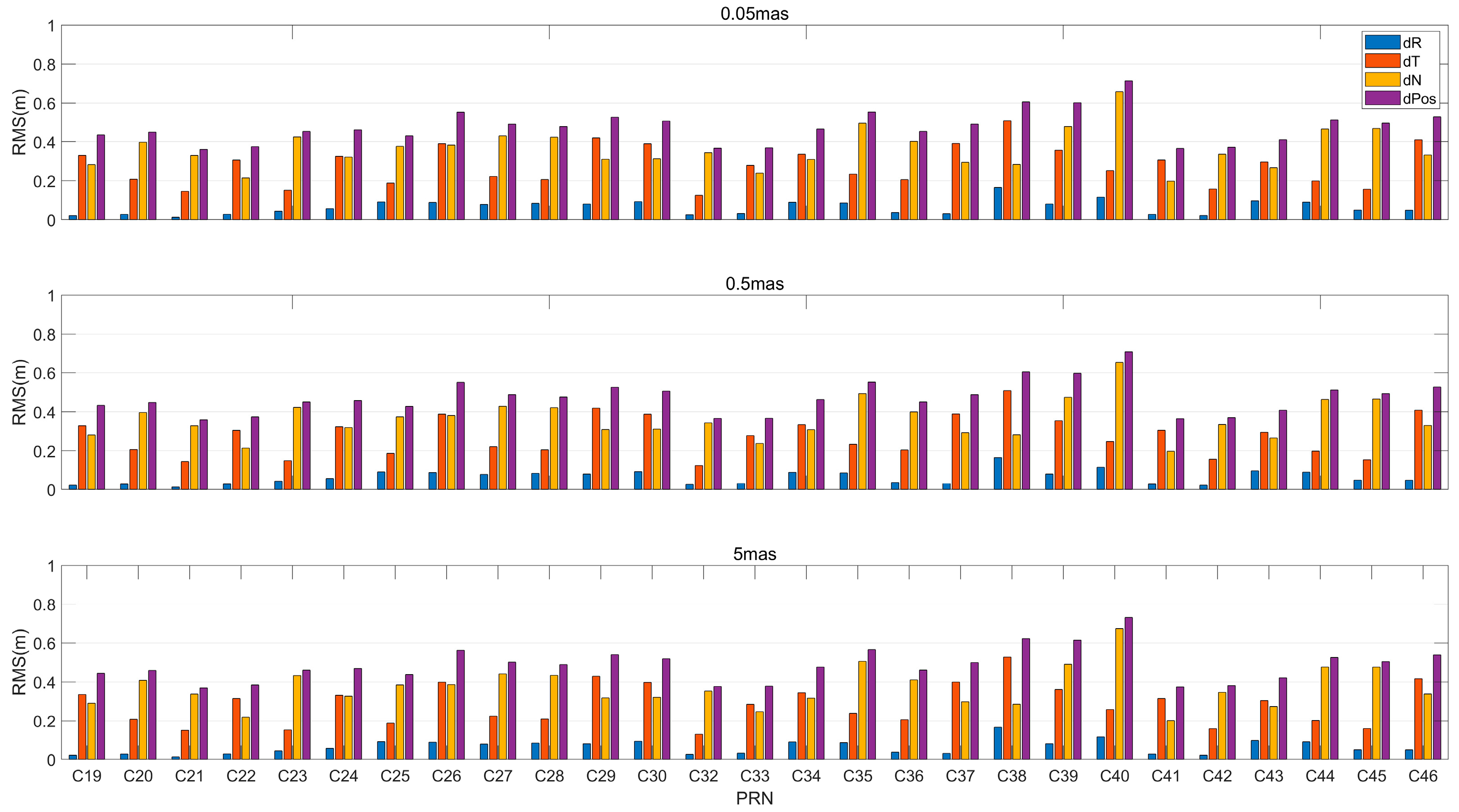 Option I: The constant system errors on the three orbital planes of the MEO satellite are set to 0.02, –0.02, and 0.04 mas.