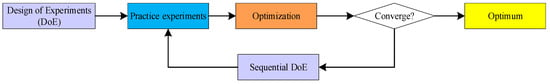 The conventional process for optimizing experimental design comprises three critical phases: initial design of experiments (DoE), practice experiments and subsequent optimization, and sequential experimentation. This process is designed to assess the influence of various experimental factors on the outcomes by systematically analyzing the experimental variables through controlled trials. Ultimately, the goal is to determine the optimal combination of these factors that will yield the desired results. The framework illustrating this experimental process is presented in Figure 1.