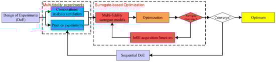 In instances where experimental costs are excessively high, the establishment of experimental environments is challenging, or labor expenditures associated with experimentation are substantial, simulation experiments grounded in computational analysis represent a feasible alternative. These simulation experiments, referred to as multi-fidelity experiments, are conducted across various scales. Optimization processes relying on multi-fidelity experiments can be effectively implemented through multi-fidelity surrogate models. The overall procedure is primarily divided into four essential phases: initial DoE, implementation of multi-fidelity experiments, surrogate-based optimization, and sequential DoE. This experimental framework is depicted in Figure 2. In the inner loop of the surrogate optimization algorithm, several key components play a crucial role in enhancing the efficiency of surrogate-based experimental optimization. These components include the selection and allocation of initial samples, the development of the surrogate model, and the formulation of criteria for optimization. Each of these elements plays a significant role in enhancing the overall performance of the optimization process.